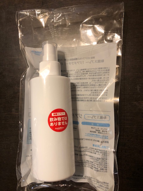 6月配送のお水ボトルの箱には下の除菌スプレーが同梱されていました。 ドラッグストアで除菌スプレーが売り切れていたのでとても助かりました。