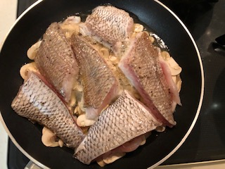 フライパンに敷き詰めた薄切りマッシュルームの上に重ならないように真鯛を並べます。蒸し焼きした真鯛から美味しいエキスが垂れるので、広げて並べたマッシュルームに吸わせるように並べます。