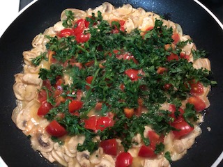 バターがほとんど溶けたら、レモン汁、トマト、パセリを加え、火の通ったマッシュルーム、バターなどとよく混ぜ合わせます。